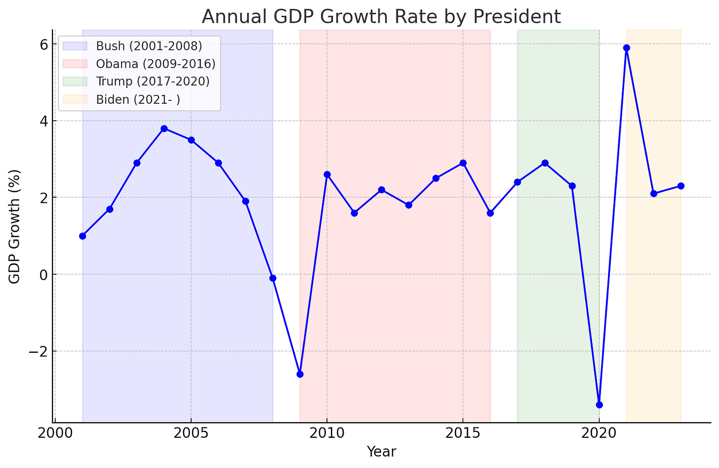 Crisis Management Matters: Voters might judge presidents more on how they handle crises than on long-term GDP averages. Effective crisis management (e.g., during recessions or pandemics) can build voter confidence. For example, Bush’s response to the 2001 recession, Obama’s actions during the 2008 financial crisis, and Trump and Biden’s handling of the COVID-19 economic fallout all shaped voter perceptions, sometimes more than overall GDP growth.